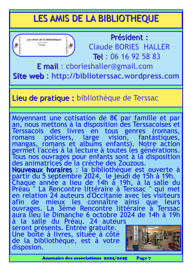 Vous trouverez sur l' Annuaire des associations sportives et culturelles 2022/2023 les informations et contacts nécessaires si vous désirez pratiquer des activités associatives à Terssac.